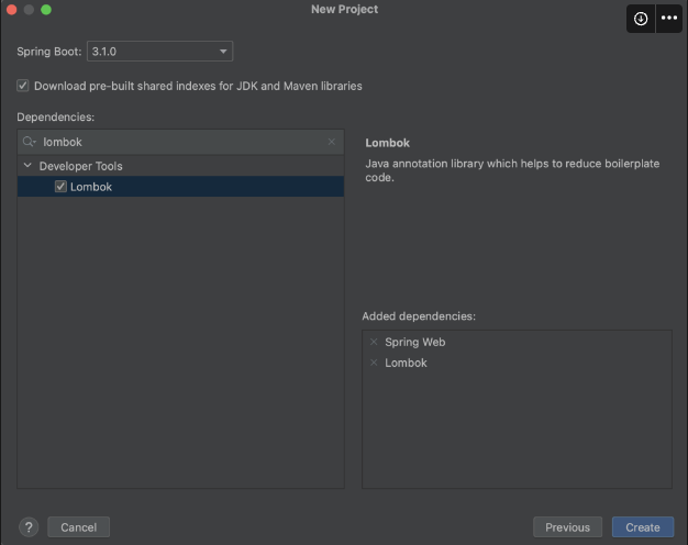 3. Dependencies๋ฅผ ์๋ ์ฌ์ง๊ณผ ๊ฐ์ด ์ถ๊ฐํด ์ฃผ๊ณ Create๋ฅผ ํด๋ฆญํ๋ค.
