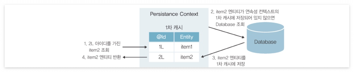μμμ± μ»¨ν μ€νΈμλ 1μ°¨ μΊμκ° μ‘΄μ¬νλ©° Map<key, value="">λ‘ μ μ₯λλ€. e</key,>ntityManager.find() λ©μλ νΈμΆ μ μμμ± μ»¨ν μ€νΈμ 1μ°¨ μΊμλ₯Ό μ‘°ννλ€. μ‘°νν μν°ν°κ° μ‘΄μ¬ν κ²½μ° ν΄λΉ μν°ν°λ₯Ό λ°ννκ³ , μν°ν°κ° μμΌλ©΄ λ°μ΄ν°λ² μ΄μ€μμ μ‘°ν ν 1μ°¨ μΊμμ μ μ₯ λ° λ°ννλ€.