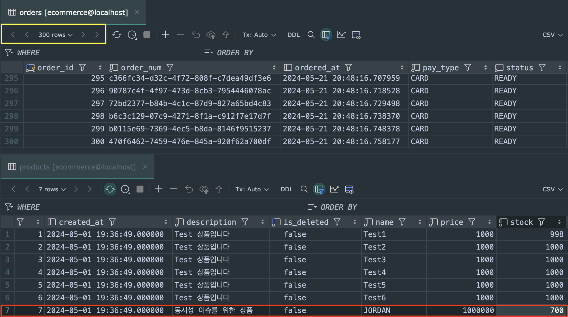 - ν μ€νΈ κ²°κ³Ό: 3μ΄ λμ μ΄ 300λ²μ μμ²μ ν κ²°κ³Ό, μ¬κ³ λ 1000κ° -> 700κ°, μ£Όλ¬Έμ 300κ°κ° μμ±λμλ€.