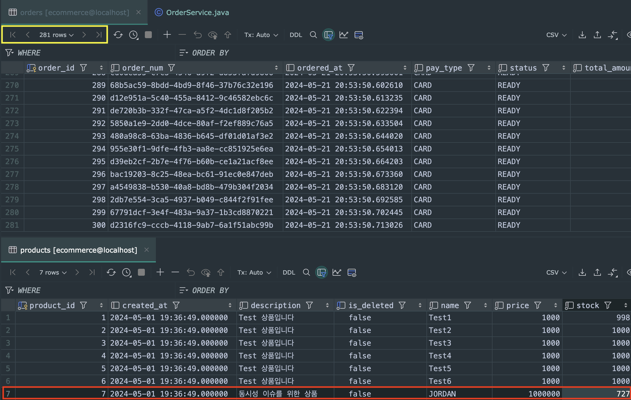 - ν μ€νΈ κ²°κ³Ό: 3μ΄ λμ μ΄ 300λ²μ μμ²μ ν κ²°κ³Ό, μνμ μ¬κ³ λ 1000κ°-> 727κ°λ‘ μ€μκ³ , μ£Όλ¬Έμ 281κ°κ° μμ±λμλ€.