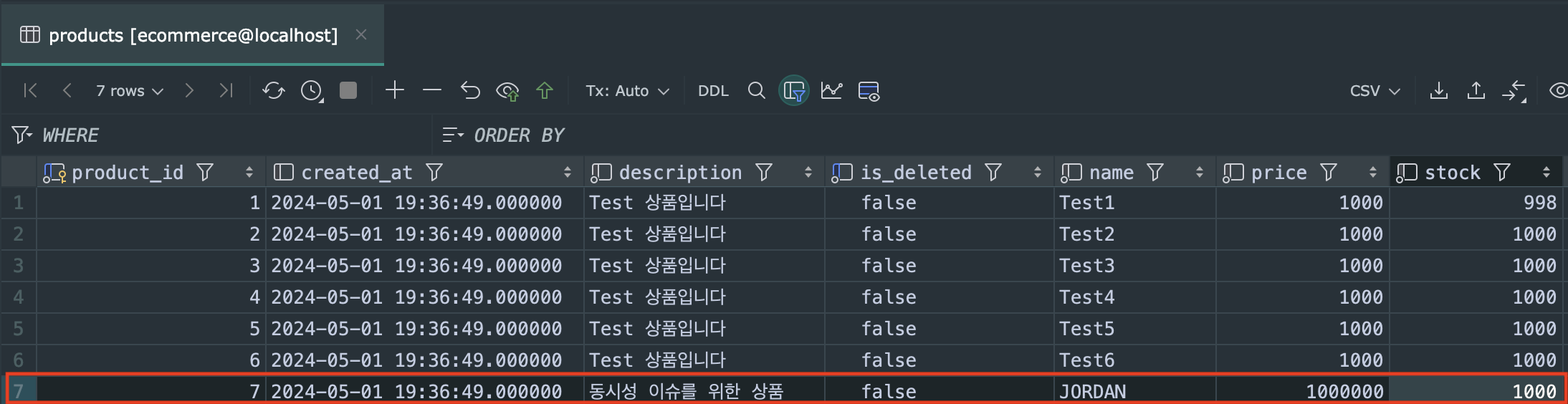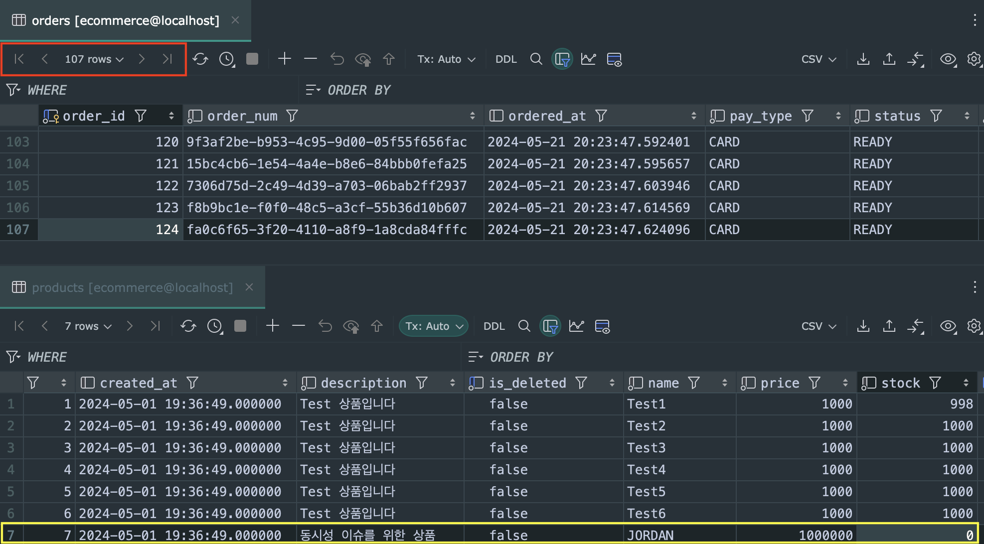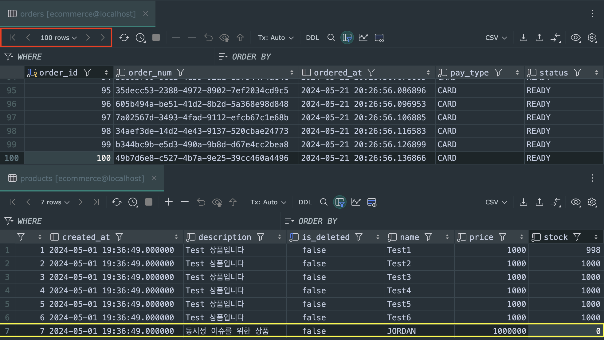 - ν μ€νΈ μλ리μ€: μ΄λΉ 100λ²μ μμ²μ νμ λ, μνμ μ¬κ³ λ 1000κ° -> 900κ°, μ£Όλ¬Έμ 100κ° μμ±λμ΄μΌ νλ€.