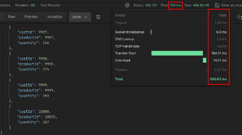 ์กฐํ ์ฟผ๋ฆฌ๊ฐ ์คํ๋์ง ์์ผ๋ฉฐ, ๋ฐ์ดํฐ๋ฅผ ์บ์์์ ๊ฐ์ ธ์ค๋ ๊ฒ์ ํ์ธํ ์ ์๋ค. ์๋ต ์๋ ๋ํ 199ms๋ก 95.5%๊ฐ ๊ฐ์ํ ๊ฒ์ ํ์ธํ ์ ์๋ค. ์บ์ฑ ์ ํ์ ์ฑ๋ฅ ์ฐจ์ด๋ฅผ ํ์ธํ๊ธฐ ์ํด ์กฐ๊ธ ๋ ๋ง์ ๋ฐ์ดํฐ๋ฅผ ์กฐํํ๋ ์ํฉ์์ ๋น๊ต๋ฅผ ํด๋ณด์.