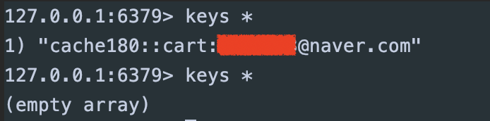 ๊ทธ ํ, ๋ค์ ํ๋ฒ ์กฐํํด ๋ณด๋ฉด ์ฟผ๋ฆฌ๋ ์คํ๋์ง ์๊ณ ์บ์์์ ์กฐํ๊ฐ ๋๋ ๊ฒ์ ํ์ธํ ์ ์๋ค. @Cacheable์ ์ํด Redis์์ ์กฐํ๊ฐ ์ด๋ฃจ์ด์ง๋ค. ๋ํ, ์ฅ๋ฐ๊ตฌ๋ ์์ ๋ฐ ์ญ์ ๊ฐ ์ผ์ด๋ฌ์ ๊ฒฝ์ฐ์ @CacheEvict์ ์ํด ๋ฐ์ดํฐ๊ฐ ์ญ์ ๋๋ ๊ฒ์ ํ์ธํ ์ ์๋ค.