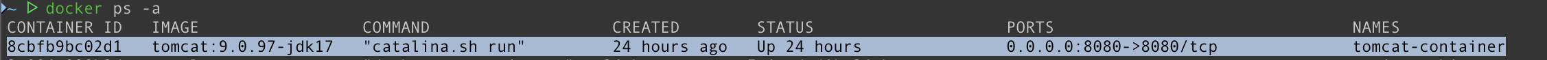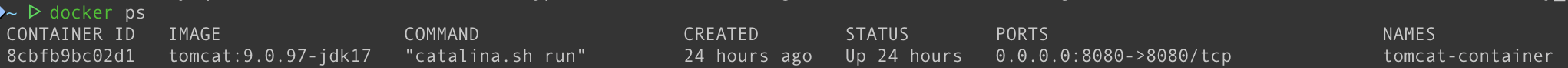 docker run -it -d -p 8080:8080 --name tomcat-container tomcat:9.0.97-jdk17