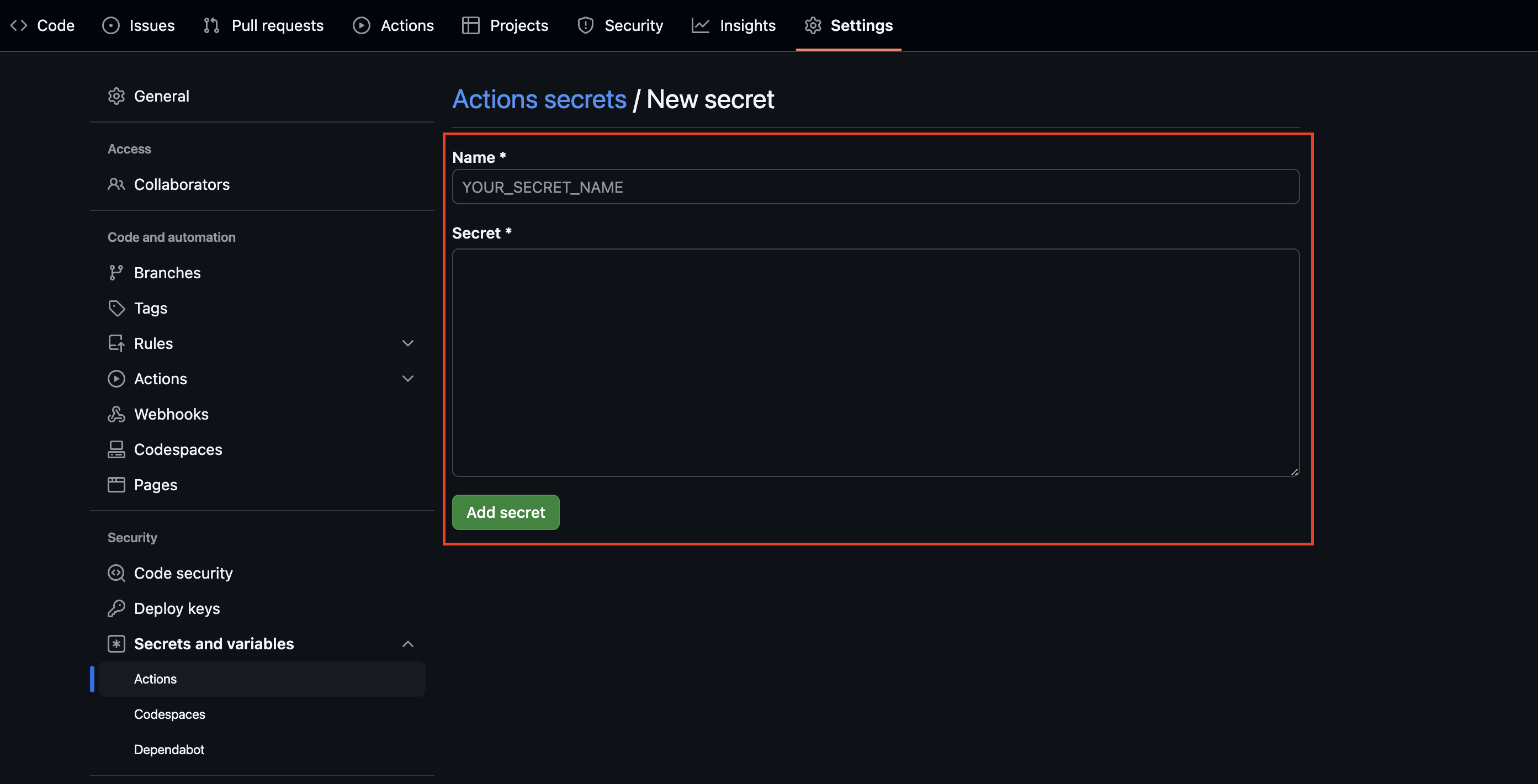 Settings ํญ์์ Secrets and variables-actions๋ฅผ ์ ํํ๋ฉด ๋ค์๊ณผ ๊ฐ์ ํ์ด์ง๋ก ์ด๋ํ๋ค. New repository secret๋ฅผ ์ ํํ๋ฉด ์๋์ ๊ฐ์ด ์๋ก ์์ฑํ ์ ์๋ค. ์์ฑ ๋ค์๋ ์์ ์ด๋ ์ญ์ ๋ฅผ ํตํด ํ๊ฒฝ๋ณ์๋ค์ ๊ด๋ฆฌํ ์ ์๋ค.