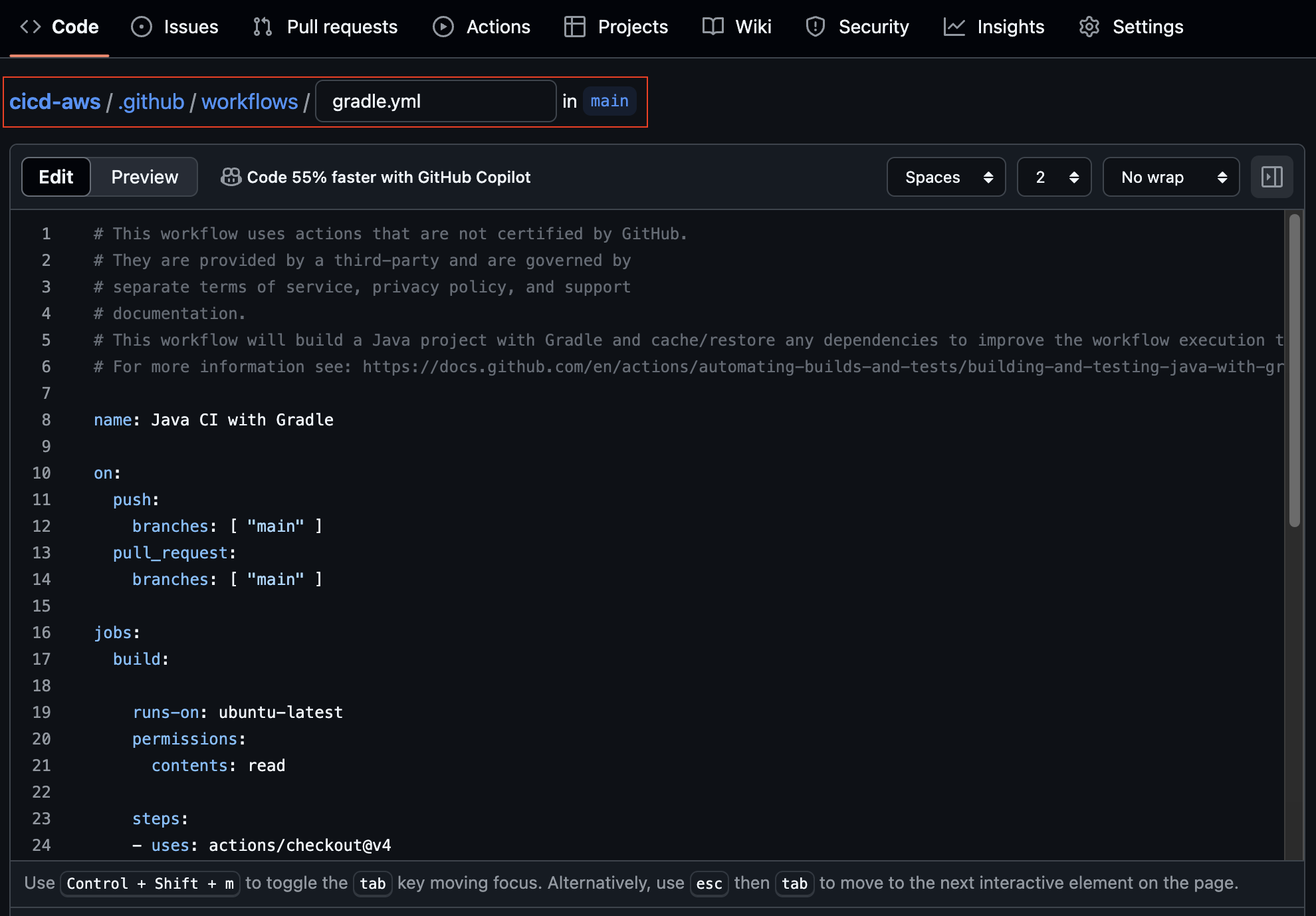 ymlํ์ผ ์์์ด๋ค. develop์ด๋ feature๋ก ์์ํ๋ ๋ธ๋์น์ ์ฝ๋๊ฐ push ๋๊ฑฐ๋ develop์ destinination์ผ๋ก ํ๋ pull request๊ฐ ์์ฑ๋๋ฉด ./gradlew clean test๋ฅผ ์คํํ๋ค.